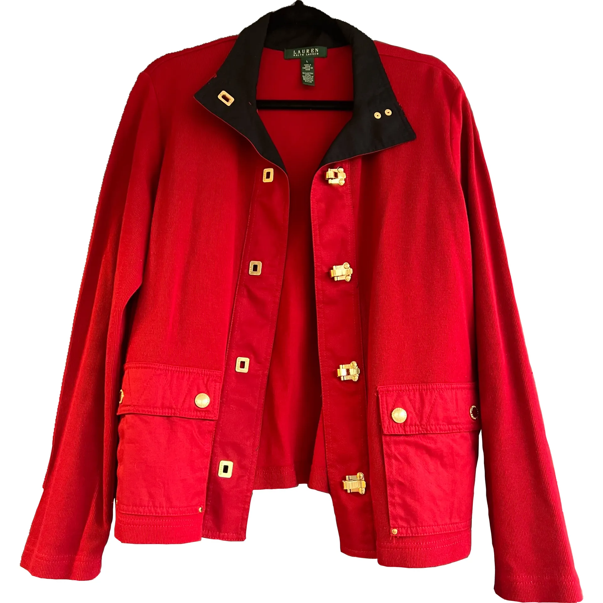 Ralph Lauren red and black long sleeve sweater with gold metallic clasps to button in front. It has... Show more