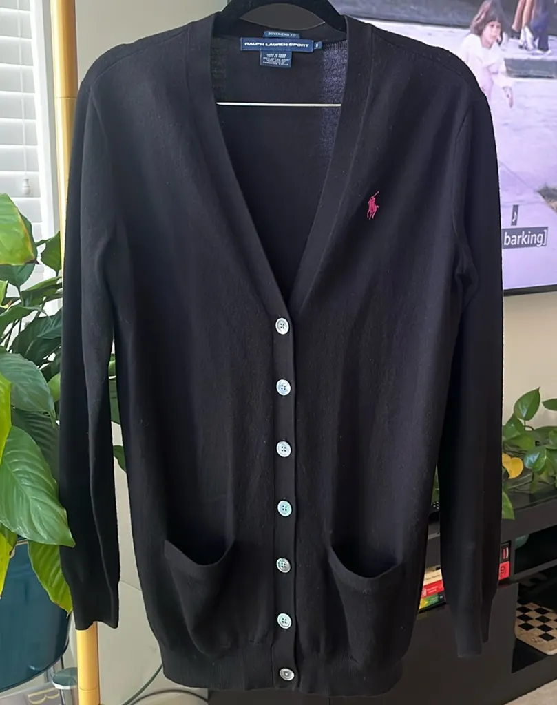 Ralph Lauren Sport boyfriend fit cardigan sweater. Size small Merino wool Black with pink logo PTP... Show more