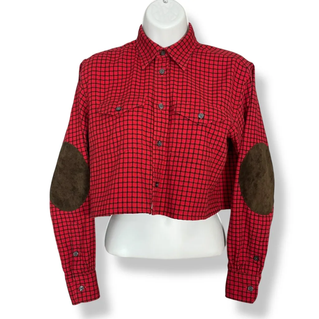 Ralph Lauren Sport women's boxy red windowpane plaid top with elbow patches turned into a crop top.... Show more