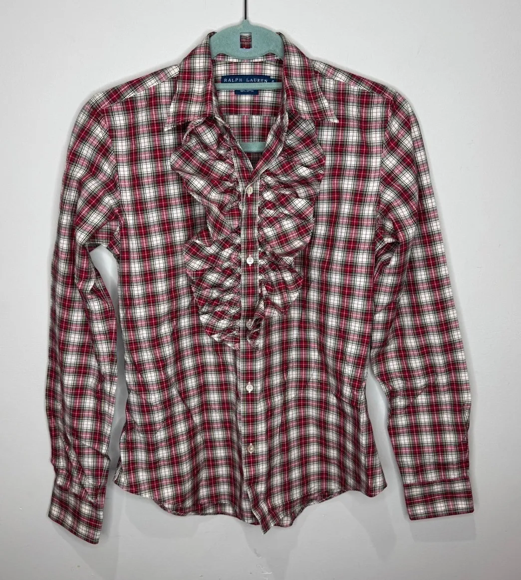 Ralph Lauren Tartan Plaid Ruffle-Trim Bib Button-Up Shirt Red White Sz 4 - $34 - From Crystal