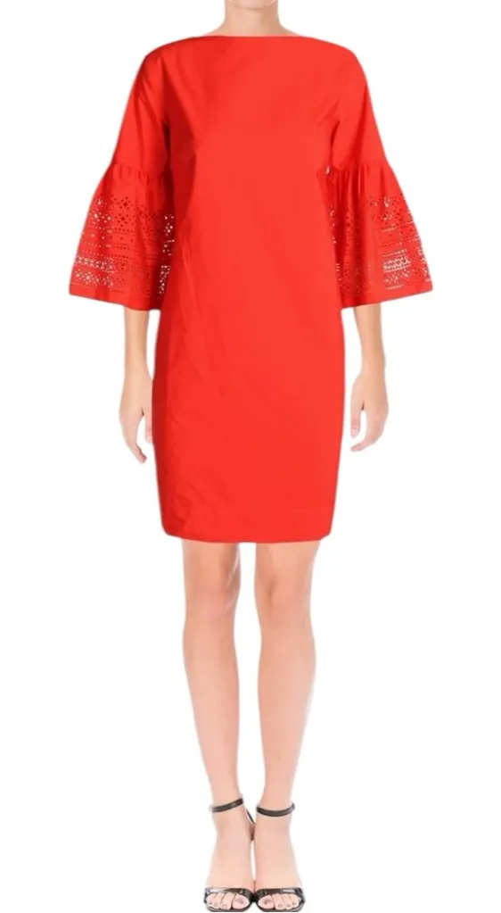 Striking bright red boxy fit dress, featuring a laser cut detailing on the elbow-length bell sleeves, bateau neckline, hidden zip back, unlined. No flaws, very minimal or no signs of wear.