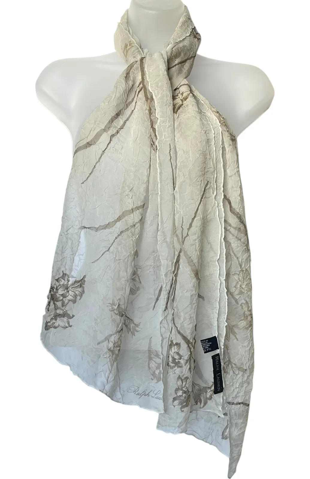 Rare crepe de chine floral scarf from Ralph Lauren, circa 1980s. Cream body with pale flower print a... Show more