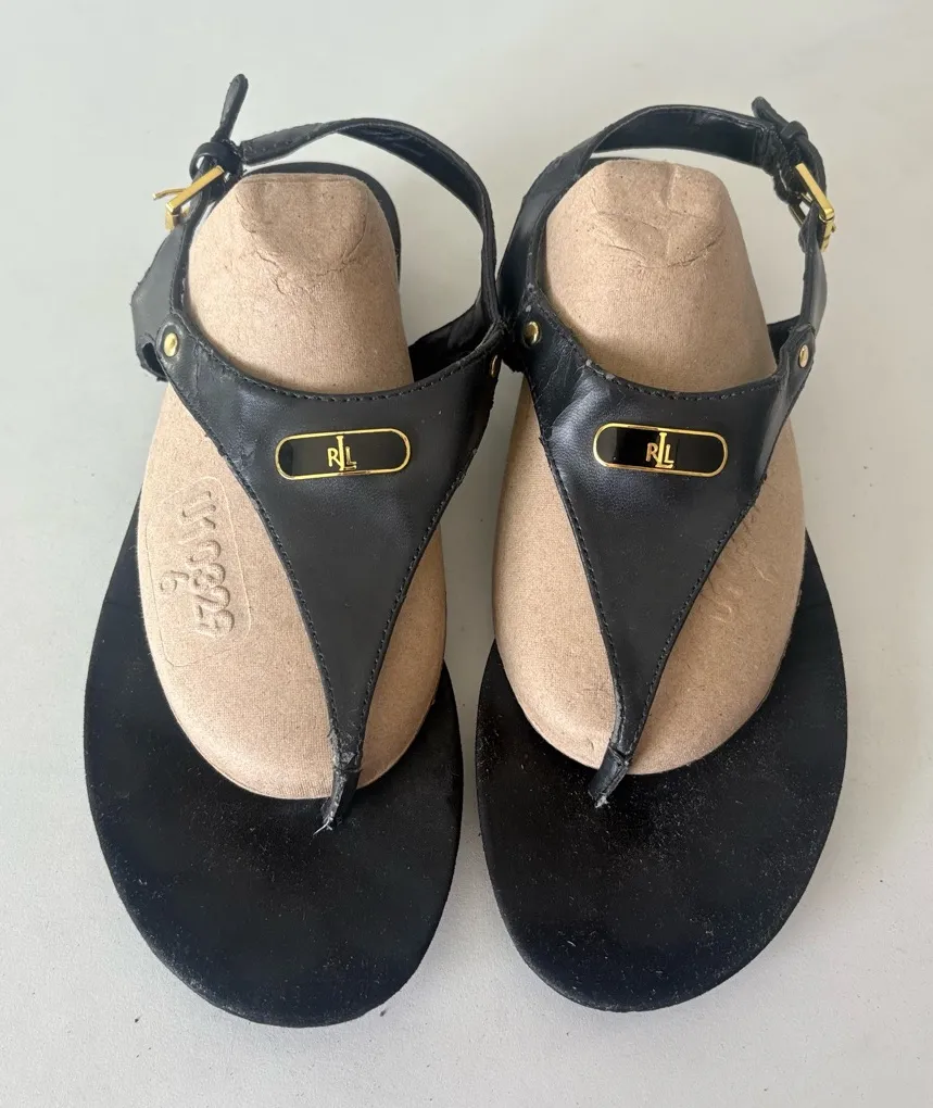 Chic black leather sandals with gold accents. Ideal for casual elegance.
