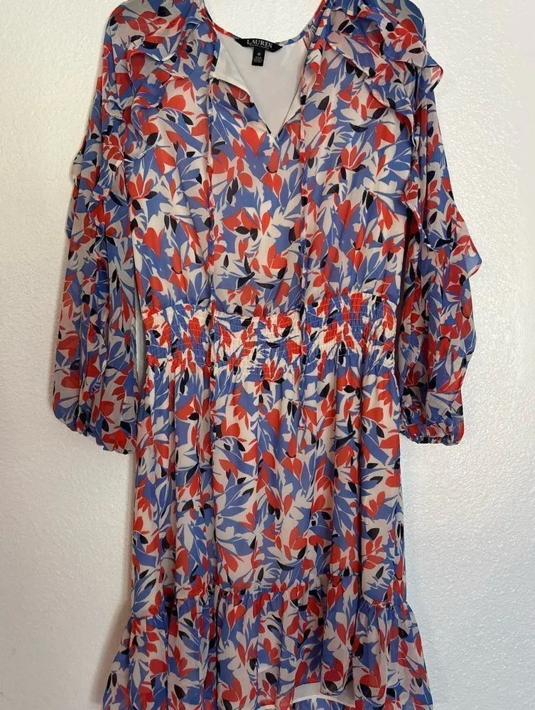 This vibrant sundress by Ralph Lauren features a flowing, tiered silhouette with a ruffled hemline a... Show more