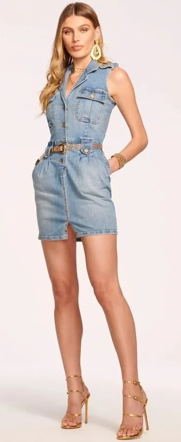 Ramy Brook Hedi Denim Mini Dress in Light Wash - Size Medium, great preloved condition! Please note that the gold belt is not included (only for show in photos). This sleek Ramy Brook “Hedi” dress presents a sleeveless, light-wash denim mini silhouette with standout detailing and elevated styling. The structured button-down front is complemented by chest flap pockets and belt loops, finished with a removable gold-toned mesh belt for edge and polish. Crafted of 98% cotton, 2% polyurethane for durability and shape. Ideal for brunch, date night or resort wear—just pair with minimalist heels or crisp white sneakers. • Denim • Button front • Button belt loop denim mini dress, light wash denim dress, sleeveless dress, button down dress, gold belt detail, Ramy Brook mini, New York designer dress, casual chic denim, resort outfit, summer night out, elevated basics, girl-boss style, 2000s revival, club to brunch dress, trend denim dress. 5307