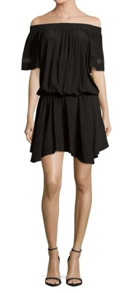 The Ramy Brook Jessica Dress in Black is a stylish and versatile piece perfect for various occasions. This off-shoulder dress features a blouson top and a kerchief skirt, adding a touch of elegance to the short mini dress. Made of polyester, this dress is designed for dry clean only and is ideal for travel, parties, or casual wear. The bell sleeves and ruched accents give it a designer feel, while the elastic waist ensures a comfortable fit. Chest: 19" Waist: 13" Length: 35.5"