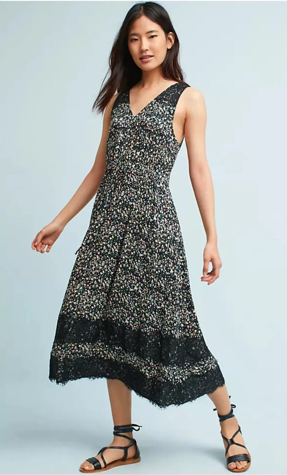 Excellent condition. Black ditsy floral print, sleeveless, v-neck with lace trim. Blouson style. Pockets at hip. Size Large pit top it 16.5 inches shoulder to hem 49 inches Rayon