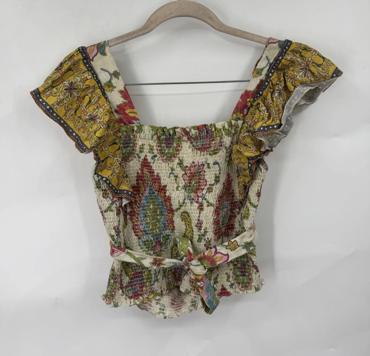 Great pre owned condition. Wrap style top. Size small. Smocked for stretch. Has a bright and beautiful paisley floral print. All measurements are approximate: 15 inches pit to pit. 12 inch length from neckline to bottom hem. I15