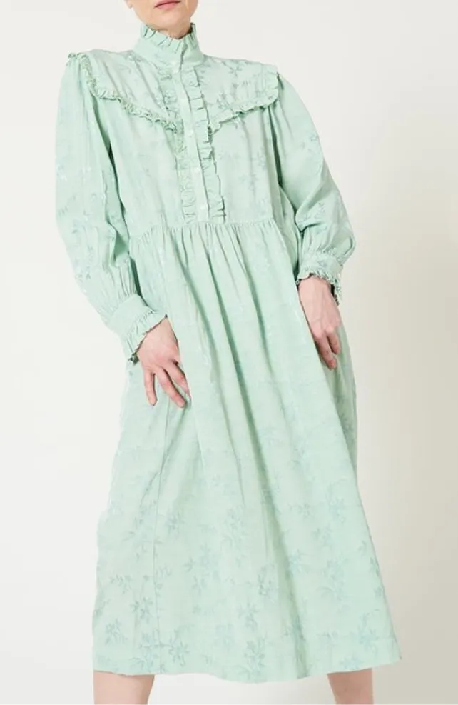 Featuring a victorian style collar with ruffle details at the neck, chest, and cuffs, we are head over heels for the mint color and floral jacquard design. The natural waist is loose making for a comfortable wear and we love the midi length and side pockets. Go all in and style back to a statement heel! Made in the USA Small production Woman-owned brand ~details-and-sizing~ Details: - Long sleeve - High neck - Loose waist - Ruffled button front - Ruffle detail along collar, and cuff - Cinched at wrists for a slightly voluminous sleeve - Mid-calf length - Floral jacquard design - Mint