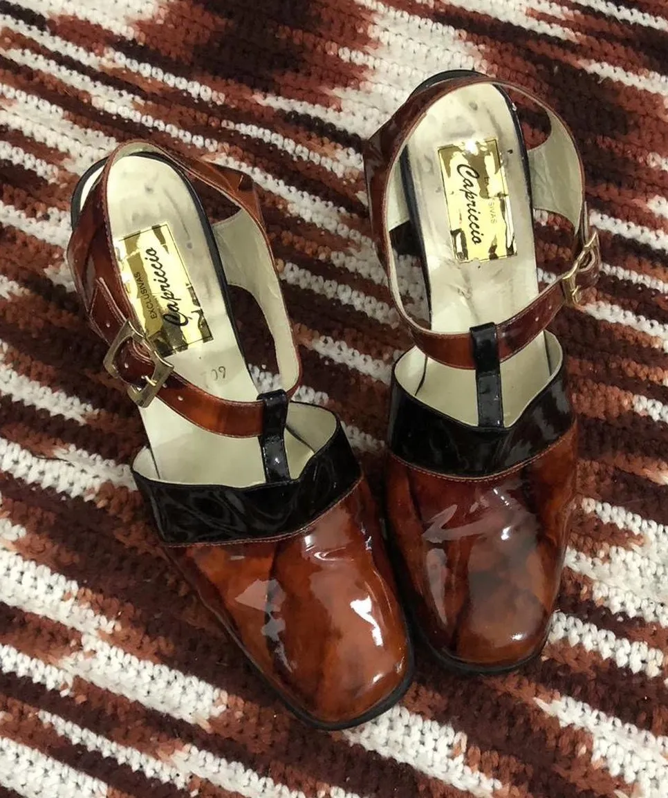 RARE 80s 90s Vintage Marble Maryjane T-strap Block Heels Pumps Chunky Whimsygoth Preppy Academia Brown Black Round Toe Patent Leather Measurements in pics Size 7 - $85 - From Victoria