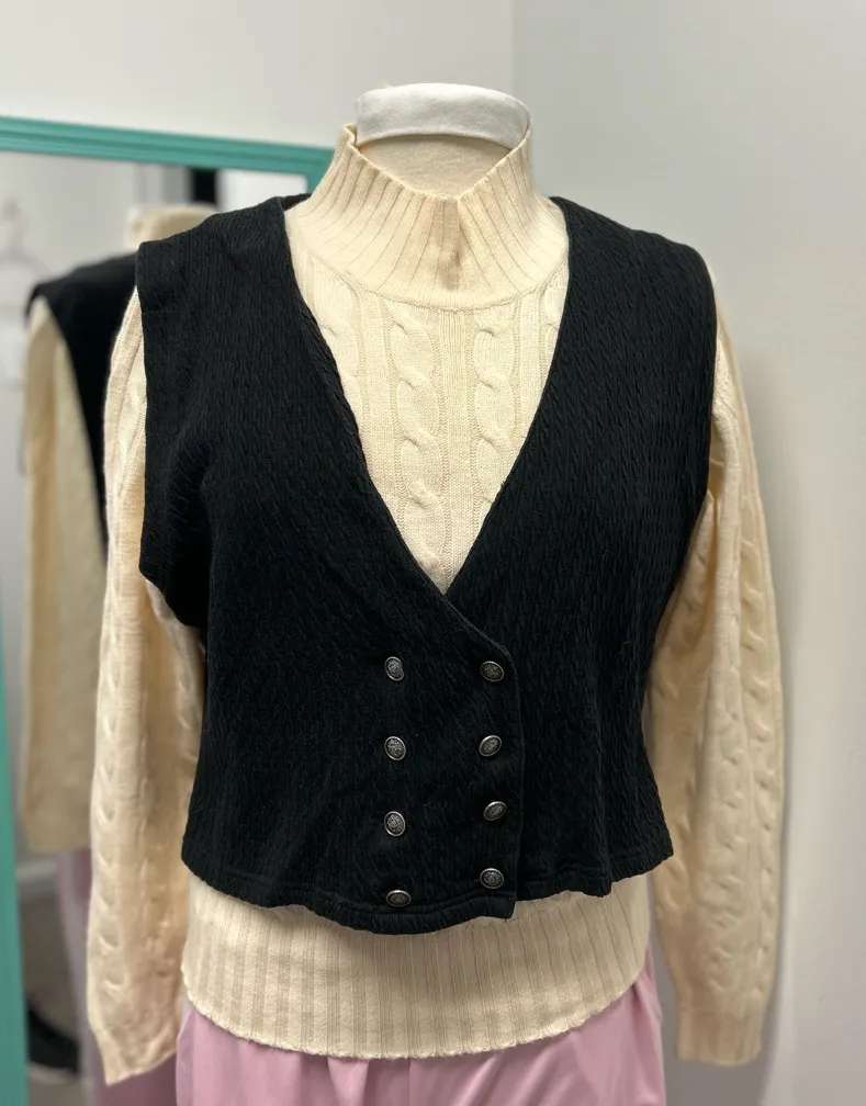 Rare piece! Made in Hong Kong. Preppy The Vintage Guess Country Club Black Double Breasted Vest for women in size Large is a stylish piece from the 80s/90s era. Made of 90% cotton and 10% nylon, this original vest exudes a new wave look perfect for a party occasion. The double-breasted design adds a touch of sophistication, while the black color gives it a classic and versatile appeal. This Guess Country Club vest is a unique addition to any vintage clothing collection, showcasing the brand's classic style and timeless appeal. Meant for layering, I paired it with a vintage merino wool cable knit sweater which is coming soon to my closet.