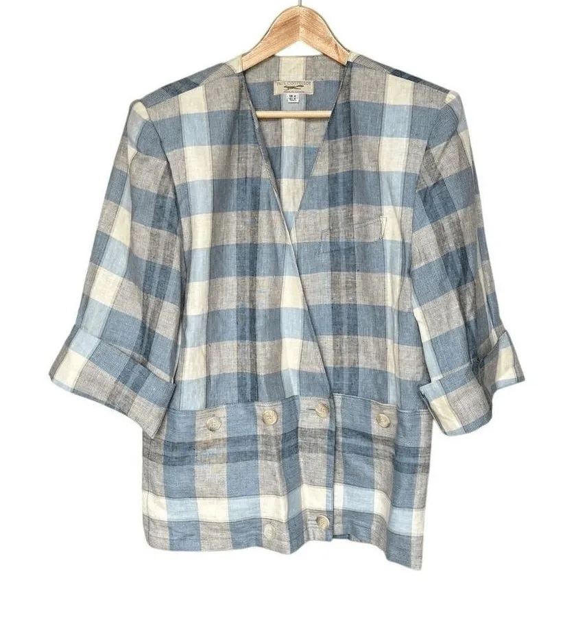 This rare vintage jacket is crafted from linen and features a blue check pattern. The unisex design, it comes in a size 4 with an oversized fit and mid-length cut, suitable for casual spring occasions. The jacket has 3/4 sleeves and a double breasted button closure, offering a comfortable and stylish option for everyday wear. Made in Ireland, it requires dry cleaning. The jacket is in excellent pre-owned condition and has shoulder pads. Type: Jacket Size: 4 Outer shell material: Linen flax Department: Unisex Color: Multicolor Pattern: Check Jacket/coat length: Mid-Length Season: Spring Closure: Button Occasion: Casual Country/region of manufacture: Ireland Fit: Relaxed Garment care: Dry Clean Only Measurements upon request 0367