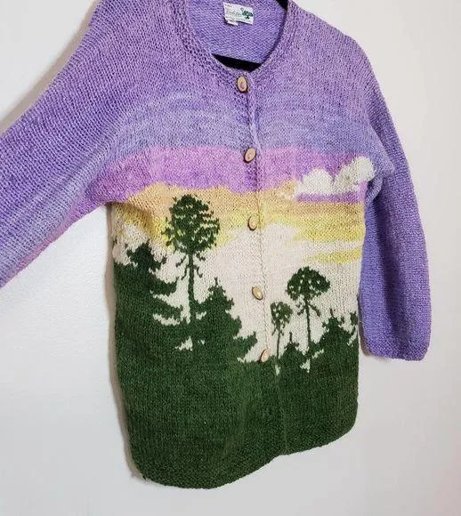 B R A N D: Vintage Violeta D E T A I L S: Rare & Unique Handmade in Chile Cabincore Cottagecore Cardigan Sweater with Nature Scene Purple, White & Green Tiny "wood logs" as buttons Please see photos for details C O N D I T I O N: Good pre-owned vintage condition Has two spots that could use repair in the future Documented in the close-up photos S I Z E: Women's size Small M E A S U R E M E N T S: (Flat laying and approximate) Shoulder to shoulder 16" Underarm to underarm 19" Shoulder to bottom hem length 23" Sleeve length 18" M A T E R I A L: 100% Alpaca S T Y L E: Nature, Forrest, Cabincore, Cottagecore, Soft, Unique, Rare, Alpaca, Cabin, Hiking