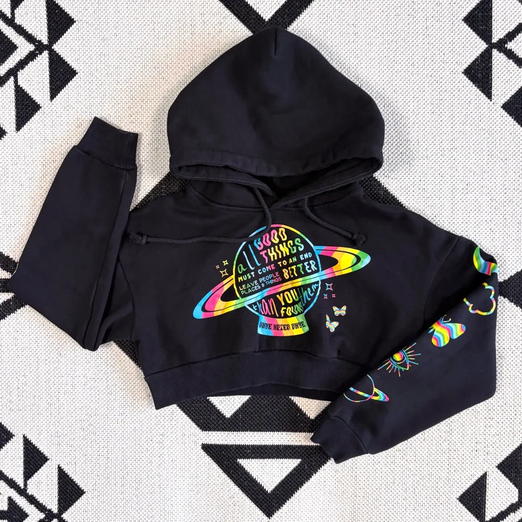 Rave After Rave Rainbow Energy Cropped Hoodie in Black in great preowned condition, minor wash wear/fading along seam edges. No flaws. Size XS, measurements are shown in photos. - Vibrant rainbow celestial graphics along front & sleeves. - Robbed cuffs & hem - Draw string hood - Thick sweatshirt fabric - Care/Content label has been removed. Reasonable offers welcome. Tags: festival edm rave apparel funky colorful unique psychedelic