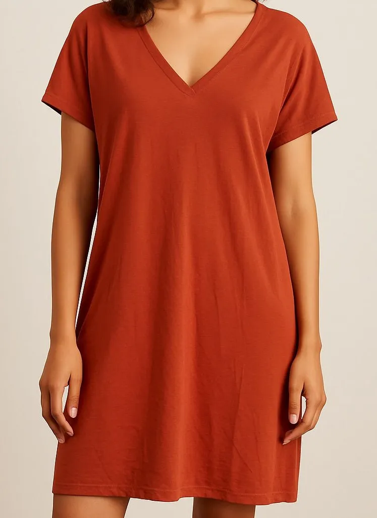 Effortless style meets sustainable fashion in this rust-toned V-neck shift dress by Raven + Lily. Pe... Show more