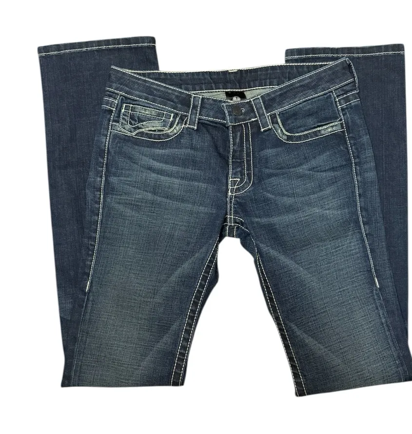 Rawkn “No Key Hole” Women’s Straight Leg Jeans Size 28 Dark Wash Contrast Stitch Description Rawkn women’s jeans, style “No Key Hole”, featuring a straight leg fit and signature contrast stitching. Low rise with button flap back pockets and light fading for that true Y2K boutique denim look. Details: • Brand: Rawkn • Style Name: No Key Hole • Style #: WK851212 • Cut #: 28 • Size: 28 • Fit: Straight leg • Rise: ~8.5–9” • Inseam: ~33” • Waist (flat): ~15” • Wash: Dark indigo with whiskering • Condition: Excellent preowned condition, no holes or stains • Features: Thick contrast stitching, button flap back pockets, Y2K / western style denim Hashtags #RawknJeans #NoKeyHole #Y2KDenim #StraightLegJeans #ContrastStitch #FlapPocketJeans #WesternDenim #BoutiqueDenim #Size28
