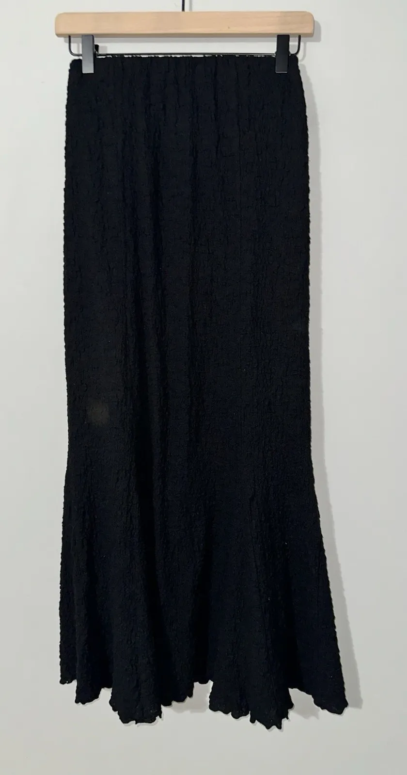Ray Beams Black Shirred Textured Mermaid Maxi Skirt Embrace modern Japanese style with this iconic mermaid-silhouette maxi skirt from Ray Beams. The sleek, curve-hugging fit through the hips transitions into a beautifully flounced hem, creating a flattering and feminine line. Unique Texture: The skirt features a subtle, all-over shirred or popcorn-like texture (sometimes called a knit jacquard), adding depth and a dimensional look to the solid black color. • Comfortable Fit: The high-waisted design with an elastic or shirred waistband (as seen in the photos) ensures a comfortable, pull-on fit that is easy to wear all day. • Mermaid Silhouette: Fitted through the waist and hip, flaring out dramatically at the bottom for an elegant, dramatic, and elongating look. • Versatile Styling: The black maxi length makes it a year-round staple, perfect for pairing with chunky knit sweaters (like the light blue one shown), graphic tees, or dressy blouses. • Material: The shell is a cotton/nylon/polyurethane blend, offering structure, a touch of stretch, and a unique hand-feel. Fully lined for comfort. Ray Beams • Beams Japan • Mermaid Skirt • Shirred Skirt • Textured Skirt • Maxi Skirt • Long Skirt • High Waisted J-Fashion • Japanese Streetwear • Cottagecore (for the shirred texture) • Coquette • Goth • Goblincore • Dark Academia • Minimalist • Y2K • Knit Skirt • Popcorn Knit • Crinkle Fabric • Fishtail Skirt • Flare Hem Seasonal: Fall Outfit, Winter Style