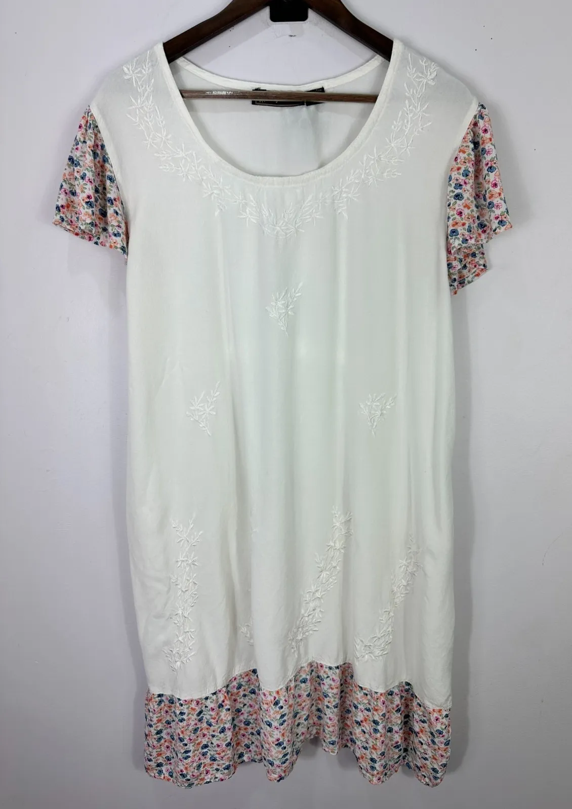 BRAND: Raya Sun SIZE: 3X COLOR: Ivory / Cream with multicolor floral accents FABRIC: 60% Cotton 40% Rayon MADE IN: India boho, cottagecore, fairycore, romantic, folkloric, artisan, earthy, vintage inspired, prairie, soft girl, whimsigoth, festival, hippie, feminine, natural fibers, summer dress
