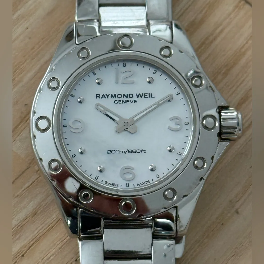 Brand: Raymond Weil Geneve Model: 3170 Spirit Gender: Ladies Description: Rare luxury watch. Gorgeous Mother of Pearl dial with stainless and luminous markers and hands. Stainless steel bracelet with hidden push-button closure. Sapphire crystal and 200M water resistance. Sapphire crystal. Just cleaned and serviced with a new battery installed. Works well! Condition: Great-Excellent. Works well! Band/Bracelet Type: Stainless steel Date Window?: No Power Type?: Quartz, Battery New Fresh Battery Installed?: Yes Box?: No Additional Links?: No Notes: Please see pictures for condition and measurements. Watch pillow are for photography staging only and are not included, unless otherwise stated. From a smoke free, pet free home. Condition Notes: -NWOT: New Without Tags. Brand new item. May have super light handling marks, if any. Item may have been a window display item for a short time before safe storage. -Like New: Extremely minor handling or wear marks, if any. Item may have been worn once or twice. -Excellent: Minor, but more noticeable light wear marks on band, case, and/or very light scratches on crystal, if any. -Great: Above average condition for the age of the watch. Light to moderate surface wear or scratches. -Good: Expected wear marks for typical standard use for the age of the watch. Noticeable surface scratches on band, case, and/or crystal. -Other: Will be described if applicable.