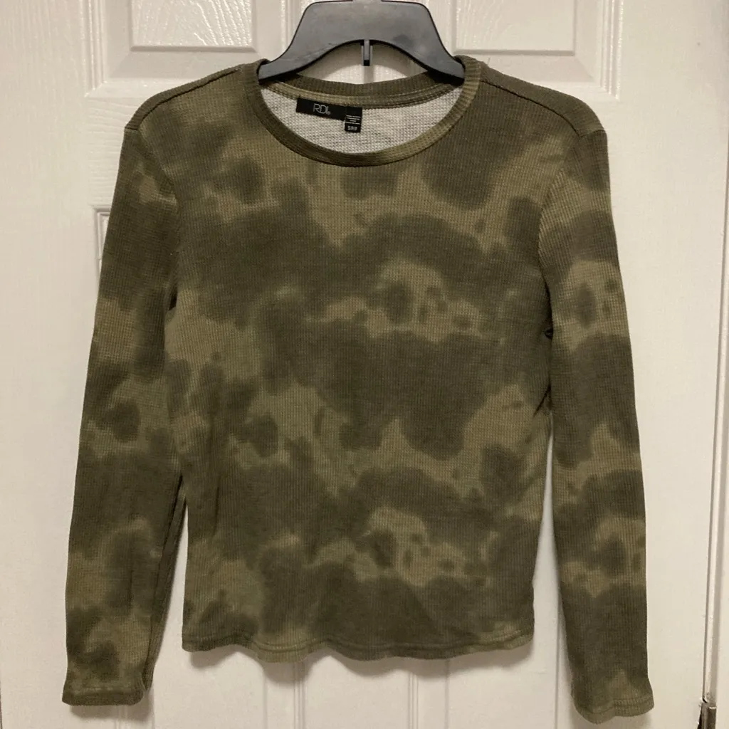Great Condition Army Green, Olive Green & Dark Green Abstract Tie Dye Watercolor Camouflage Pattern Waffle Knit/Thermal 52% Cotton/48% Polyester Pit to Pit: 18.5” Length: 21.5” Size Small