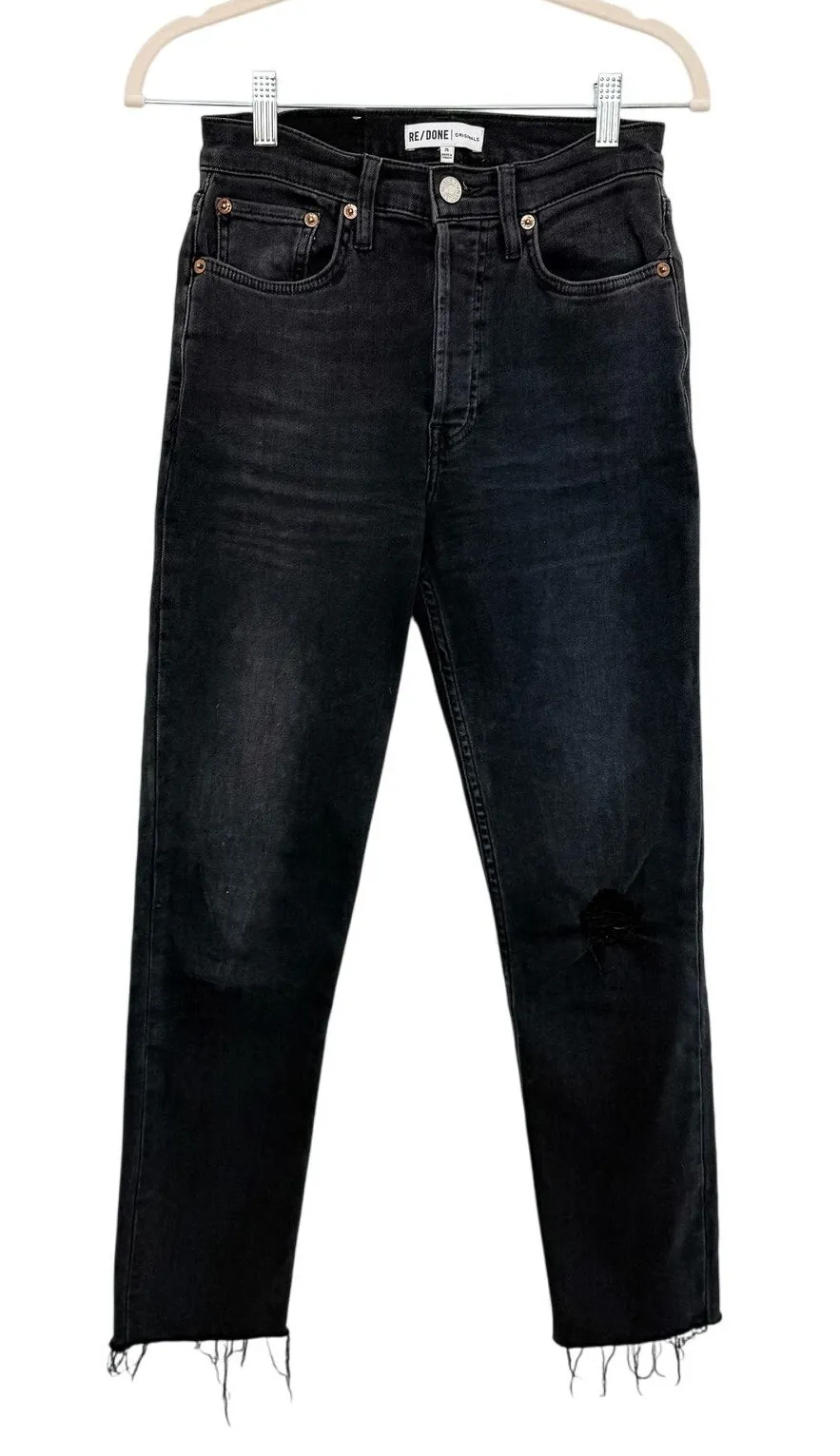 Re/Done Originals Button Fly High Rise Fray Hem Jeans Black - Womens Size 26 - Excellent condition. No visible flaws. See all photos for details. - Approximate Measurements (taken flat lay): Waist: 13" Rise: 11" Inseam: 27" Outseam: 37" Style 196-3WHRAC