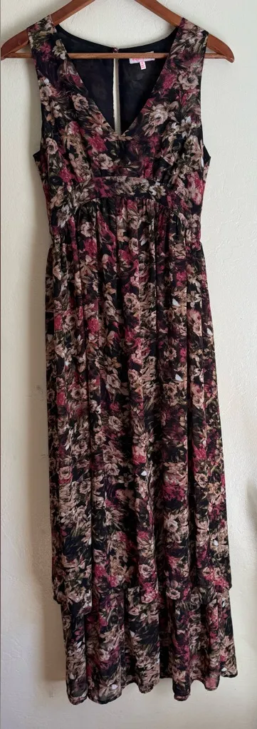 This Dark Floral Sleeveless Maxi Goddess Dress with a V-neckline and high-low hem is a stylish and versatile piece perfect for various occasions such as travel, parties, or casual wear. Made from lightweight chambray fabric, the dress features a ruffle accent, zip & button closure, and a flattering high waist. The long length and sleeveless design make it ideal for the summer, fall, and spring seasons. The bohemian theme and floral pattern add a touch of femininity to this chic dress from the Re:named brand. Hand wash only to maintain its quality. Approximate measurements: Length from shoulder to hem: 57 inches Bust: 16” x2 = 32 inches Waist: 14 inches Condition: Like-New!!