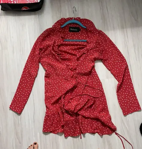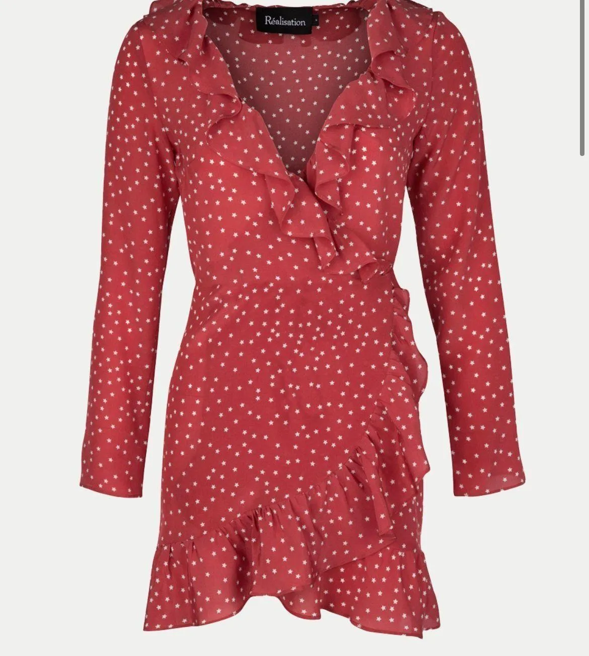 Worn once! Great condition 🤍 Classic Alexandra dress with red stars Alexandra - she’s all 80’s short mini dress wrapped up in one. That perfect ruffle around your neck, cheeky length, sexy wrap - she’s the classic original in all the prints you want to be wearing day to night. Windows down, white corvette, and a sexy pump to match. The Alexandra - baby you can drive my car.
