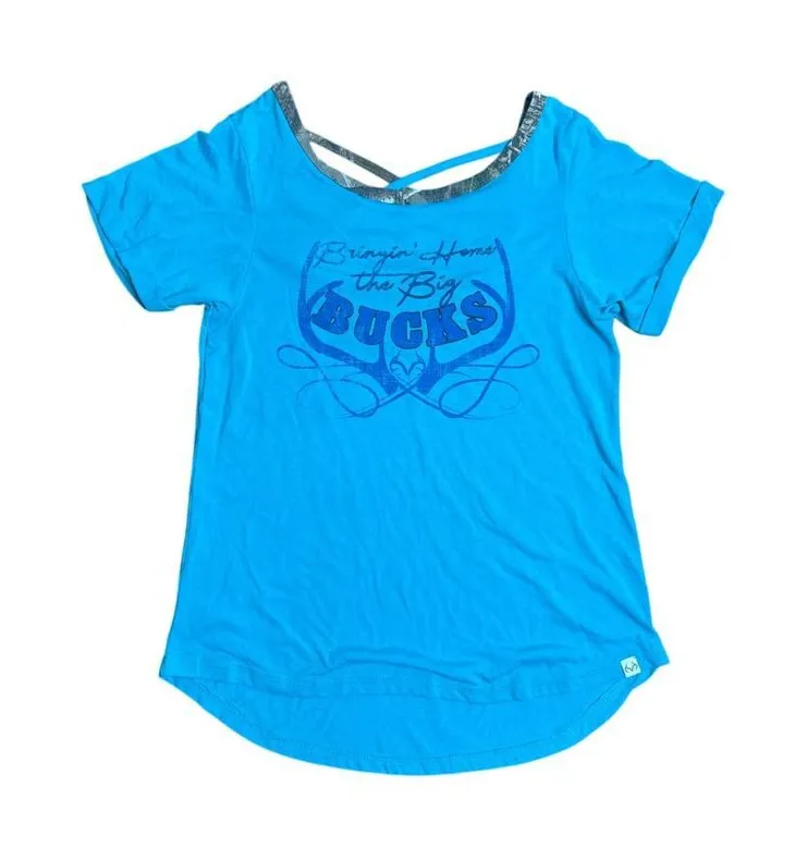 Show off your outdoor pride with this Realtree by Colosseum Women’s Tee in a vibrant turquoise blue with camo trim accents. Made from a soft, lightweight fabric, this shirt offers a relaxed, looser fit that’s perfect for casual days, hunting trips, or country-inspired outfits. The front graphic features the fun phrase “Bringing Home the Big Bucks” in bold lettering — a perfect match for any outdoor enthusiast. The back of the shirt features a low-cut crisscross design trimmed in Realtree camo, adding a stylish, feminine twist that keeps it breathable and unique
