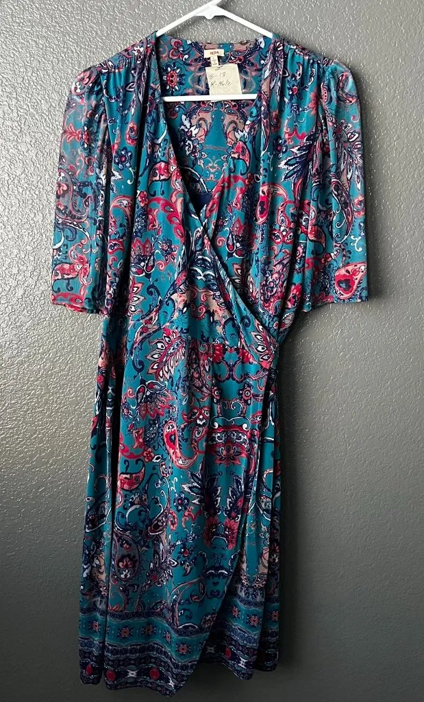 Size & Measurements: Tag Size: Large P2P: 18" Length: 36" Notes: This eye-catching paisley dress from Reba features a faux-wrap silhouette with a deep V-neckline, soft puff sleeves, and a flattering draped front. The vibrant teal, pink, and navy palette is perfect for summer parties, resort wear, or casual boho styling. Flowy and comfortable, it offers a breezy midi fit with feminine flair.