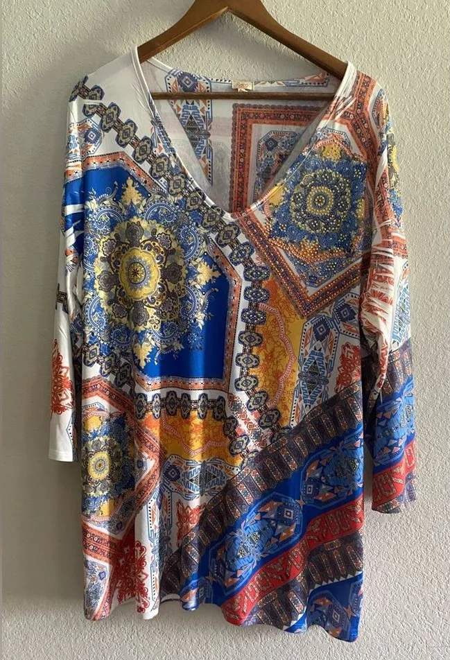 Reba Woman V-neck Jeweled Gem Embellished 3/4 Sleeve Tunic Top Blouse Blue White Orange Multicolor plus 1X boho Measurements: Approx. laying flat Pit to pit: 25” Length: 31” pre-owned