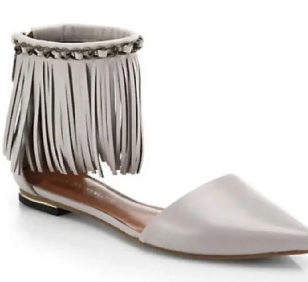 Rebecca Minkoff Faith Fringe Flats Zip Closure Ankle Strap Pointy Shoes Gray Grey Women's Sz 6 Ve... Show more