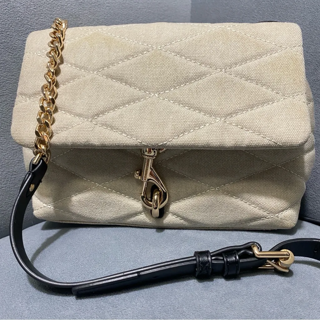 Authentic Rebecca Minkoff Edie Diamond Quilt Canvas Crossbody Bag in Light Gray with gold-tone hardw... Show more