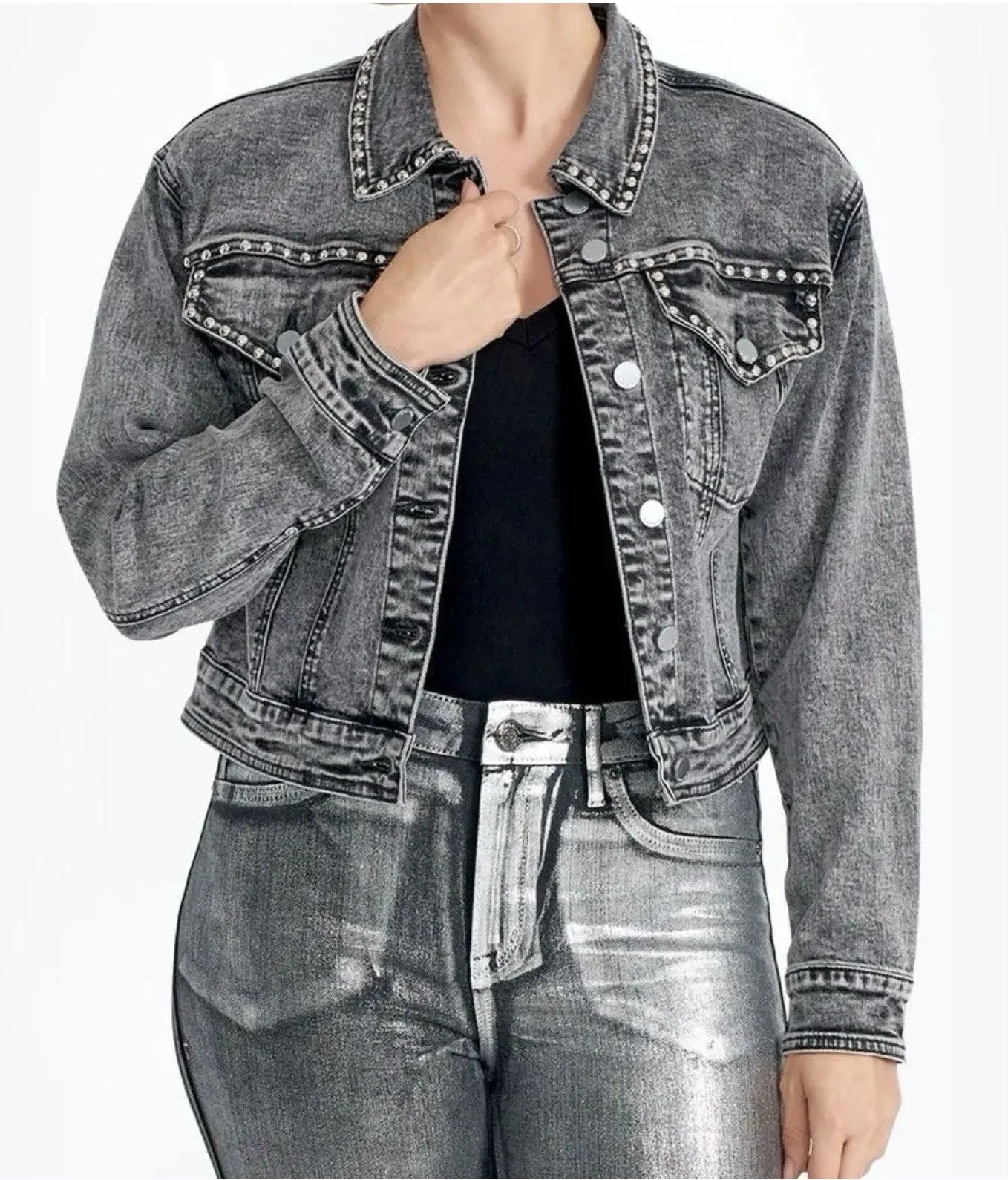 Rebecca Minkoff Studded Denim Jean Jacket Black Gray 100% Cotton Collared Cropped Biker Grunge Fall... Show more