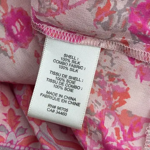 A pretty paisley print in a palette of pink brings boho charm to this easygoing silk midi dress with a split neck and fluid, body-skimming fit. Front neck tie Sleeveless Unlined Size: 8 100% Silk - chiffon look and feel Care: Dry Clean Measurements (flat): Length: 44.5 “ Pit to Pit: 18” Excellent preowned! 033-39