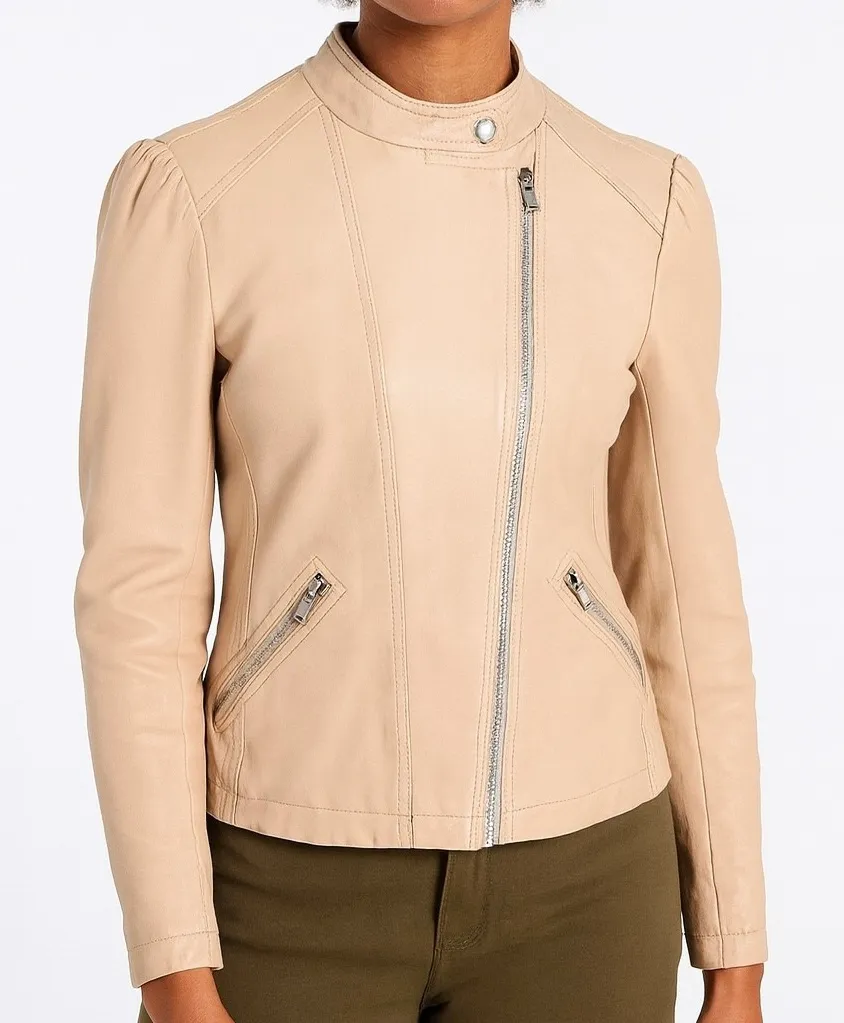 Rebecca Taylor Garment Washed Leather Moto Jacket in Nude Blush Pink. Excellent used condition with no flaws. Size 6. Chest - 18.5" Length - 21.5" Zip up closure with snap button at neck Silver exposed metal Zipper pockets Long sleeves with Ruched elbows Pleated shoulders Nice Soft jersey knit heathered gray interior lining 100% genuine lamb leather SKU 9825