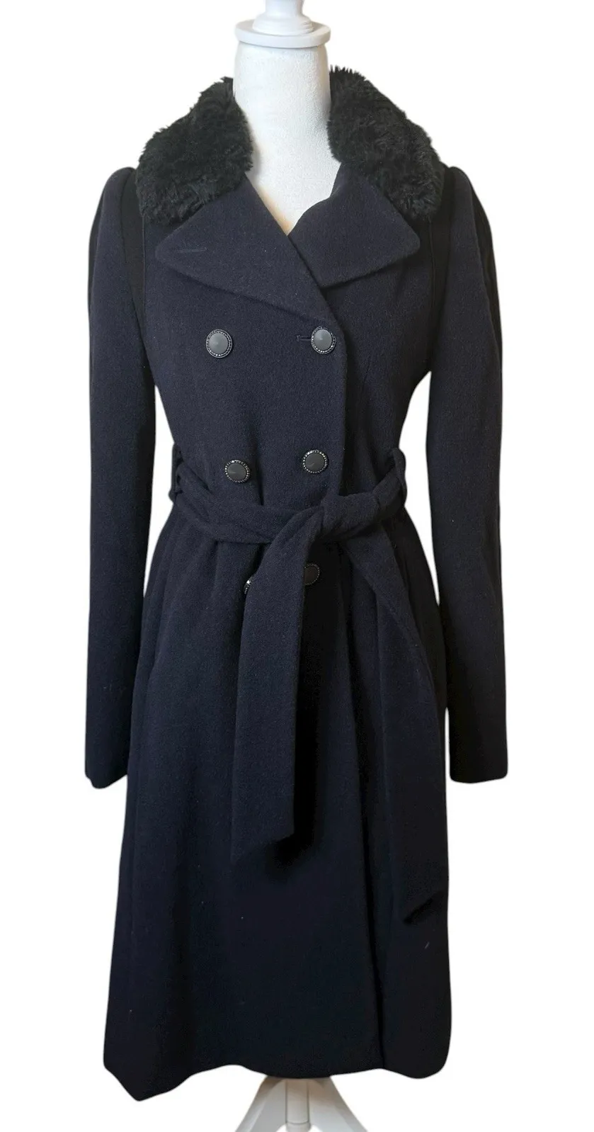 Excellent Pre-Owned Condition (see pics for details) Features: •Style Profile: Rebecca Taylor Navy Black Wool Peacoat Faux Fur Collar Double Breasted Belt Sz 0 •Flaws: None •Please see photos for measurements (in inches) laying flat- Pit to Pit: 17" Shoulder to shoulder: 13" Sleeve: 25" Shoulder to hem: 41" •Washing Instructions: Dry Clean Size: 0 Color: Navy Blue & Black Tags: Wool, Dressy, Neutral, Quiet Luxury, Designer, Luxury, Old Money, Sophisticated, Elegant, Timeless, Minimalist, Academia, Ivy League Smoke free home. I am happy to answer your questions and am open to reasonable offers! Super fast shipping: I ship out the next business day! Please note that all pre-owned items may have slight imperfections.