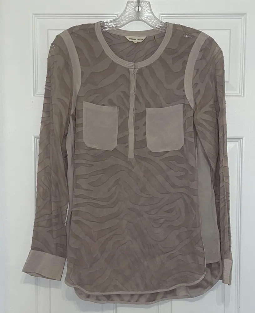 Rebecca Taylor Liger Double Black Top in Sleek, size 4. Excellent used condition. It is a taupe color with a hint of mauve or lavender. Shell: 50% silk, 50% cotton Combo: 100% silk Dry clean only Front button placket Patch breast pockets Revolve Style No. RT-WS619 Manufacturer Style No. 514 756 B029