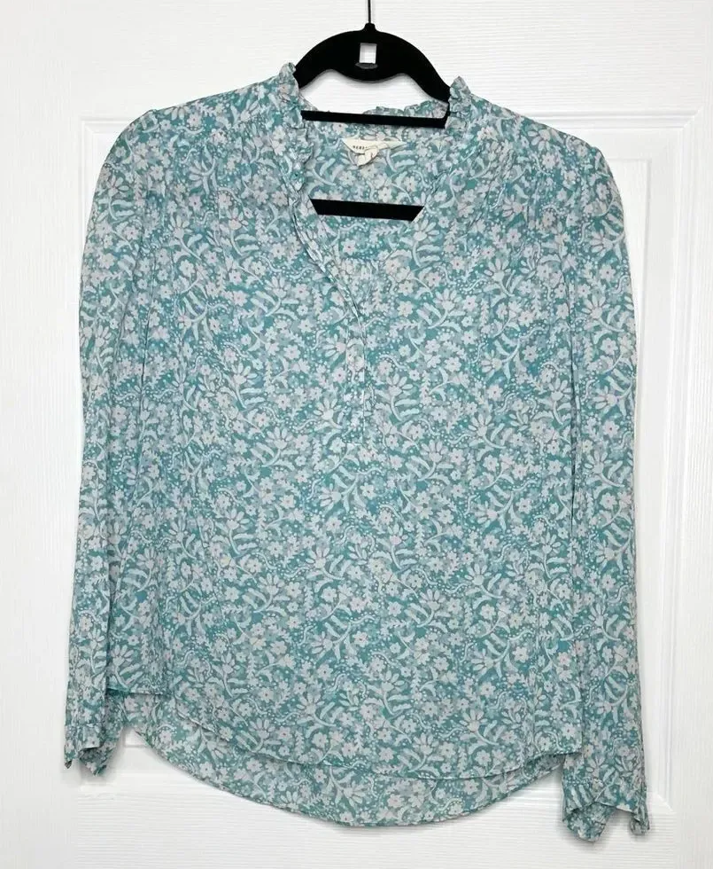 Long sleeve, ruffle collar pop over blouse with partial button front. Button cuff closure. *Size 2,... Show more