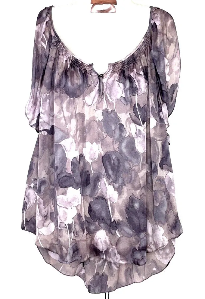 ***Small snag/pull. See photo.*** Rebecca Taylor silk watercolor print in purple. Cold shoulder fl... Show more