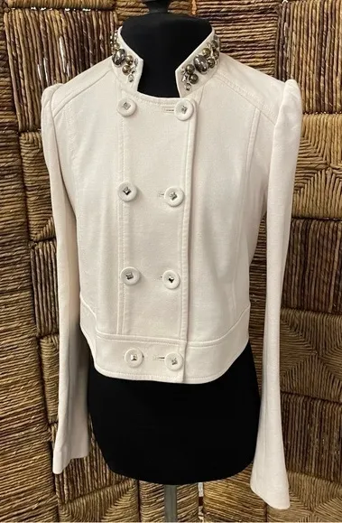 Rebecca Taylor jacket in women's size 4. Sturdy cotton blend fabric has some stretch to it. Embellished band collar. Fabric covered buttons are also embellished. Long sleeves. Approximate measurements 17” under the arms 17.5 front length 24 3/4" sleeves Smoke free home. Questions? Leave a comment below!
