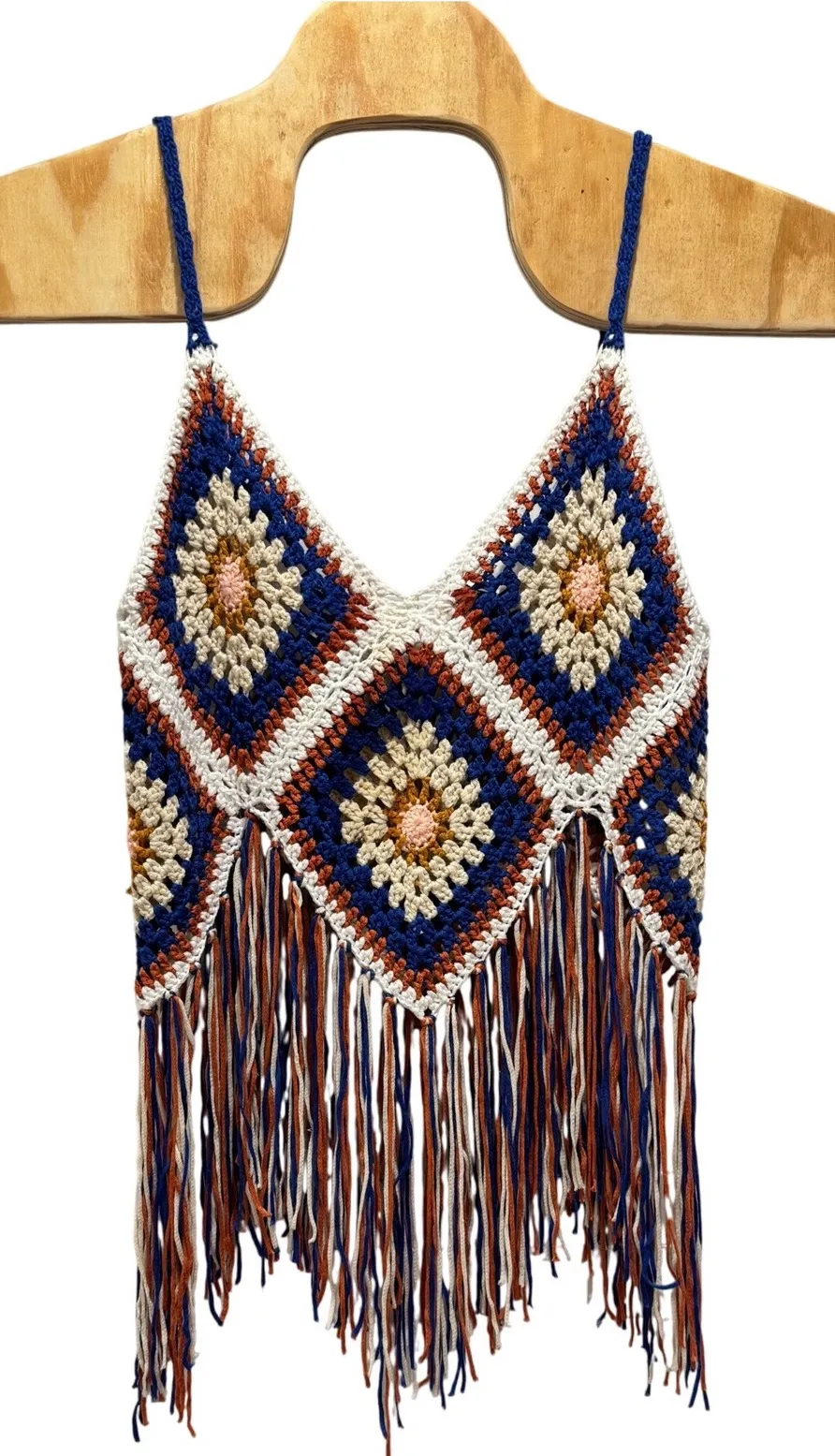 Unleash your inner free spirit with this captivating crochet tank. The intricate square pattern, featuring a harmonious blend of blue, orange, cream, and a touch of pink, draws the eye and evokes a sense of artistry. The eye-catching fringe cascades from the bottom, adding movement and a playful touch. This sleeveless top is perfect for layering or wearing on its own during warmer weather. Envision yourself wearing this unique piece to a music festival, a casual beach gathering, or a summer picnic in the park. Measurements: • Length (from top of strap to bottom of fringe): 18 inches • Width (across the chest): 16 inches One small discoloration on front white part as photographed. Color: Blue Type: Tank Department: Women Style: Cropped Material: Polyester Neckline: V-Neck Sleeve Length: Sleeveless Sleeve Type: Strappy Sleeve Accents: Fringe, Crochet Pattern: Geometric Features: Lightweight, Bohemian, Festival, Sleeveless, Crochet Character: Bohemian, Hippie Fit: Regular Keywords: crochet tank top, fringe tank top, bohemian top, festival top, sleeveless top, blue orange tank, square pattern top, retro top, 70s style, summer top, beach top, medium tank top, Rebellion, hippie top, boho chic