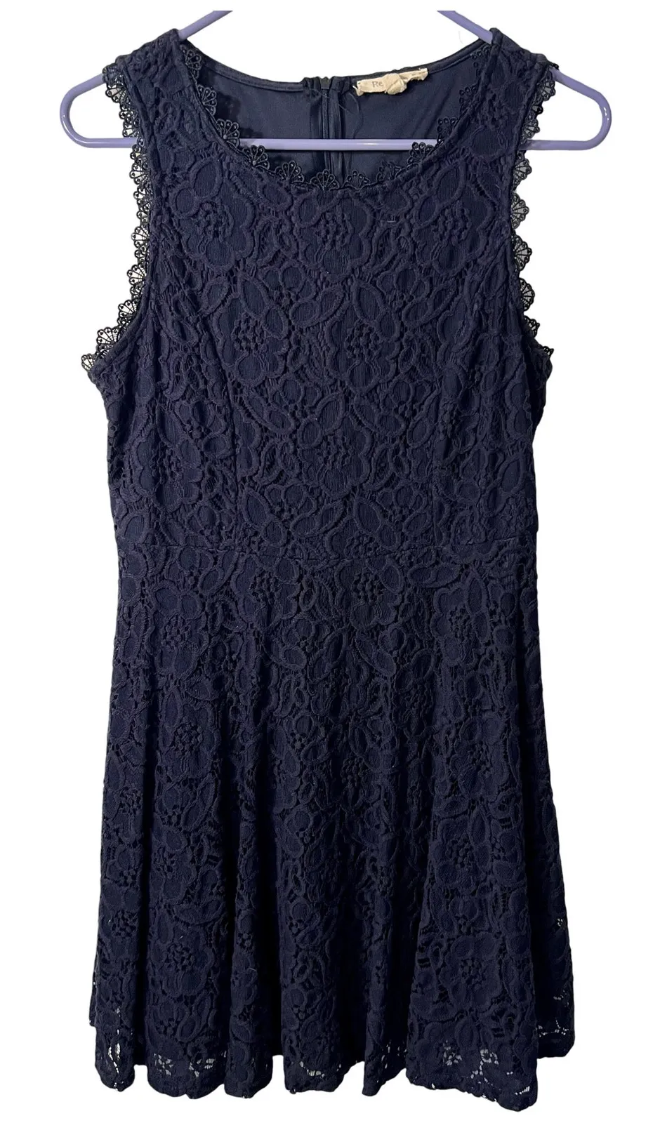 REBELLION - Junior Dress Size L Blue Lace Sleeveless Round Neck Back Zip 17" armpit to armpit 15" shoulder to shoulder 33" length 30" waist excellent condition * navy blue floral-patterned lace overlay * sleeveless * round neckline * back zip closure * lined * perfect for occasions like weddings, parties, cocktails, or even business events * lightweight blend of polyester and cotton with lace fabric * collarless * ** all items stored in a smoke-free & pet free home