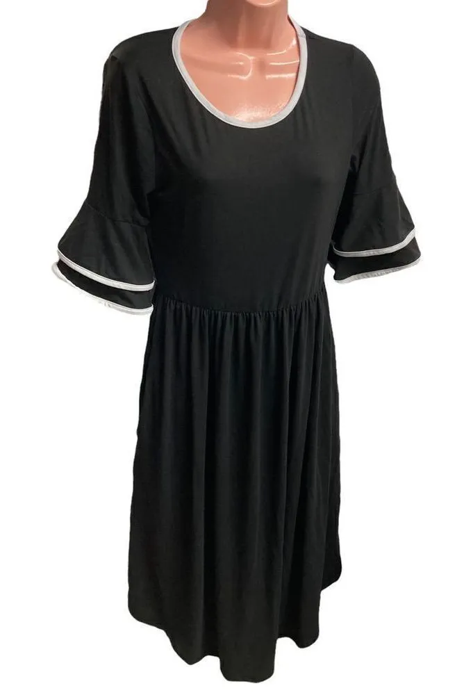BRAND: Reborn J COLOR: Black with White Trim CONDITION: Good SIZE: Small MEASUREMENTS:See Pictures MATERIALS: 95% Polyester, 5% Spandex OTHER DETAILS: Hand Wash Very soft, asymmetrical hem ( shorter on side, longer in front), measures 30.5 from pit to hem, measures 42” from back neckline to hem. Bell Sleeves, Elastic Waistband, fit & flare