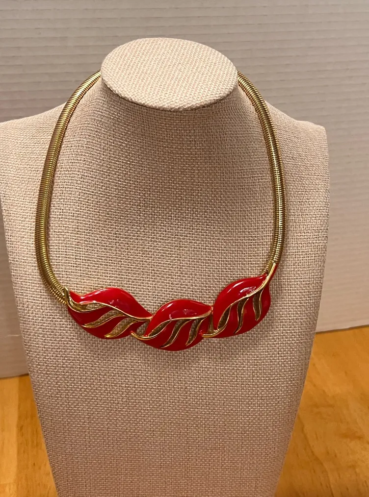 This stunning necklace features a bold red and gold design, perfect for adding a touch of elegance to any outfit. Ideal for special occasions or everyday wear. Holiday statement piece red enamel Goldtone vintage I found no markings on this piece. Purchased at a jewelry estate. Madmen coquette girl modern MCM 70s 80s