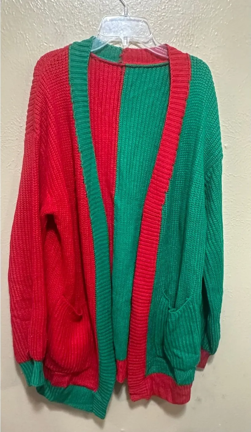 Style: Cardigan Color: Red Department: Women Type: Sweater Material: Acrylic, 100% Acrylic Sleeve Length: Long Sleeve Features: Pockets, Color Block, Open Front, Knit Please check out photos thread on back is pulled in a place. Pattern: Solid Fabric Type: Knit Character: Christmas, Holiday Keywords: Color Block Cardigan, Knit Cardigan, Red and Green Sweater, Christmas Cardigan, Holiday Sweater, Womens Cardigan, Small Cardigan, Open Front Cardigan, Acrylic Cardigan, Cozy Sweater, Holiday Fashion, Retro Sweater, Statement Sweater No measurements will be provided!