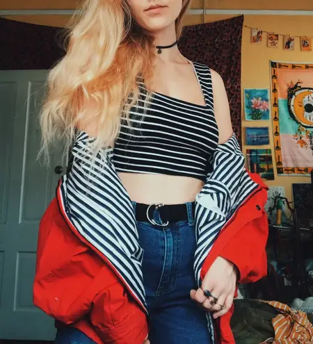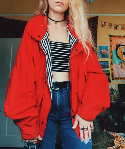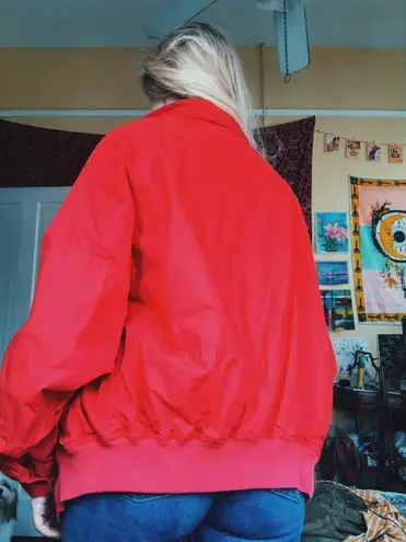 First purchase? Use my code for $10 off: DATVS the cutest red bomber jacket with white & blue inside lining perfect for chilly days & super vintage look a few small stains on the sleeve but aren’t noticeable when being worn (shown in picture)
