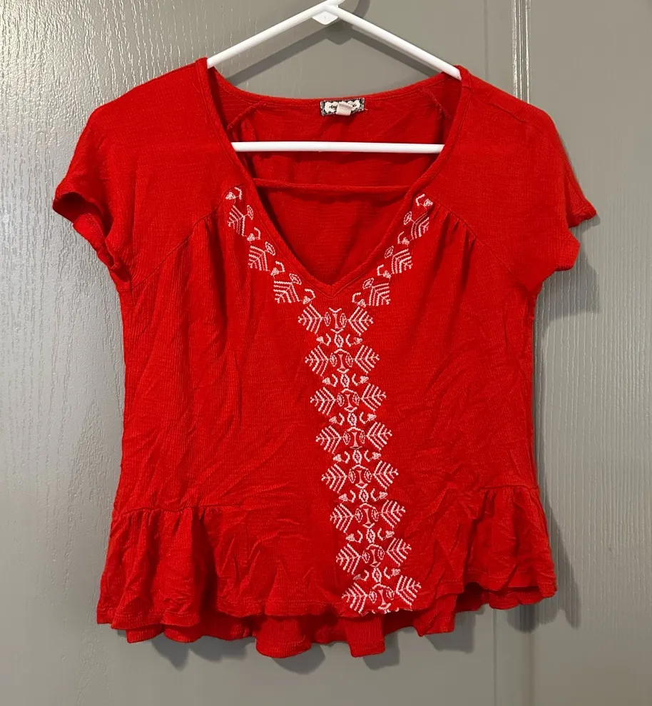 Vibrant red top with white embroidery. Features short sleeves and a ruffled hem. Ideal for casual we... Show more