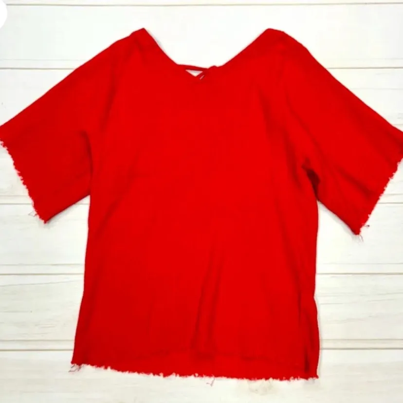 Vibrant red top with frayed hem. Perfect for casual wear. Size small Slightly oversized Would medium Back ties & slightly open Retail was 200$ Worn once and washed Supposed to be frayed distressed look