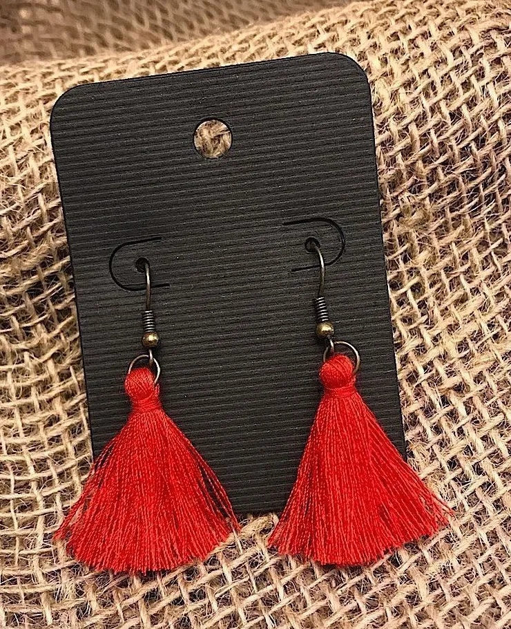 Red Brassy Boho Tassel Earrings NEW Boutique Gift Ready Add a dose of chic to any outfit with these boho minimalist tassel earrings. Rustic red tassels adorn a brassy ring. Feather-light tassels are strung onto 21mm fishhook brass ear wires: ear wires are nickel-free. See model photo & Earrings next to Measuring tape for size reference. Rustic Bohemian Red Tassel Earrings Brass Ear Wire NEW