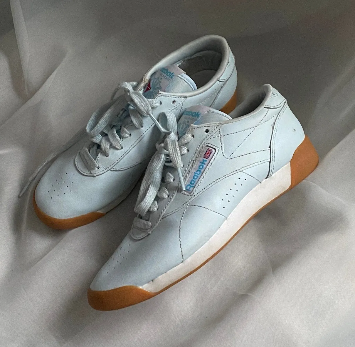 Women's Reebok Freestyle Hi casual sneakers in a light blue hue. These classic athletic shoes featu... Show more